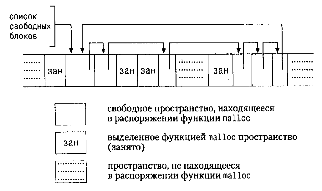 Никакого ранее скомпилированного массива фиксированного размера, из которого выделяются куски памяти, не будет. Функция malloc запрашивает память у операционной системы по мере надобности. Поскольку и другие действия программы могут вызывать запросы памяти, которые удовлетворяются независимо от этого распределителя памяти, пространство, которым заведует malloc, необязательно представляет собой связный кусок памяти. Поэтому свободная память хранится в виде списка блоков. Каждый блок содержит размер, указатель на следующий блок и само пространство. Блоки в списке хранятся в порядке возрастания адресов памяти, при этом последний блок (с самым большим адресом) указывает на первый.