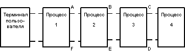 Процессы связаны программными каналами (pipes) ОС UNIX. Прямая информация при обработке операторов передается по каналам A, B и C. Результаты, включая сообщения об ошибках, передаются по обратным каналам D, E и F. Процессы работают строго синхронно: после посылки прямого сообщения каждый процесс дожидается получения ответного сообщения, а после посылки ответного сообщения - ждет получения очередного прямого.