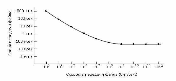 зависимость времени передачи от скорости передачи для файла в 1 Мб на