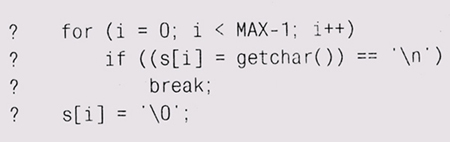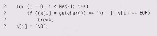 Теперь надо проверить и другие граничные условия. Ситуации, когда во вводе содержится очень длинная строка или не содержится символов перевода строки, предусмотрены кодом — на этот случай существует ограничение i значением МАХ-1. Однако что будет, если ввод абсолютно пуст (в нем нет вообще ни одного символа) и первый же вызов getchar возвратит значение EOF? Надо добавить проверку и для такого случая: