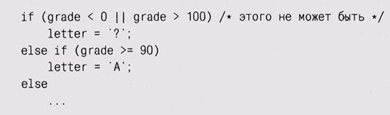 Assertion failed: n > О, Утверждения особенно полезны при проверке свойств интерфейса, поскольку они привлекают внимание к несовместимости вызывающего и вызываемого блоков системы и зачастую помогают найти виновника этой несовместимости. Так, если наше утверждение, что n больше О, не проходит при вызове функции, это сразу указывает на ошибку в вызывающей функции, а не в самой функции avg. Если интерфейс изменился, а внести соответствующие коррективы мы забыли, утверждения помогут выловить ошибку до того, как она приведет к возникновению серьезных проблем. Используйте подход защитного программирования. Полезно вставлять некоторый код для обработки (хотя бы просто предупреждения пользователю) случаев, которых "не может быть никогда", то есть ситуаций, которые теоретически не должны случиться, но все же имеют место (например, из-за сбоя где-то в другом участке программы). Хороший пример — добавление проверки на нулевой или отрицательный размер массива в функцию avg. Еще одним примером может стать программа, выставляющая оценки по американской системе; очевидно, что отрицательных или очень больших значений появиться в ней не может, но лучше все же это проверить:
