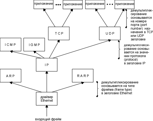 На рисунке 1.2 мы показали четыре протокола, каждый на своем уровне. FTP это протокол прикладного уровня, TCP - протокол транспортного уровня, IP - протокол сетевого уровня, а протоколы Ethernet обеспечивают канальный уровень. Семейство протоколов TCP/IP объединяет в себе множество протоколов, однако наиболее часто используемые названия для данного семейства это TCP/IP, TCP и IP (иногда семейство называют Семейство Протоколов Internet).