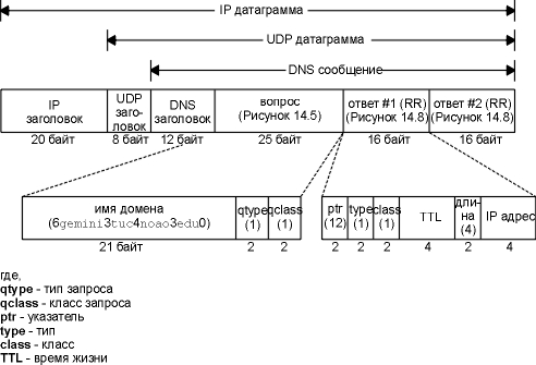 На рисунке 14.10 показан обмен пакетами между разборщиком и сервером DNS.