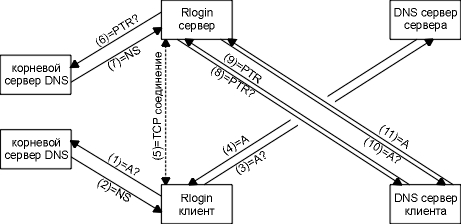 Давайте рассмотрим еще один пример, который описывает несколько функций DNS, о которых мы рассказали раньше. Мы запустили клиента Rlogin, подсоединившись к Rlogin серверу в каком-то удаленном домене. На рисунке 14.16 показан обмен пакетами.