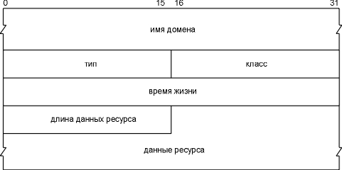 Последние три поля в DNS сообщении это ответы (answers), полномочия (authority) и дополнительная информация (additional information), общий формат называется записью ресурса (RR - resource record). На рисунке 14.8 показан формат записи ресурса.