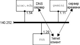 В этом примере мы указали разборщику на хосте sun (где запущен клиент Telnet) использовать сервер DNS на хосте noao.edu (140.252.1.54). На рисунке 14.9 показано взаимное расположение этих трех систем.