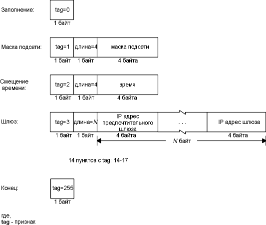 Пункт шлюза это один из пунктов с переменной длиной. Длина всегда кратна 4, а значение - это 32-битные IP адреса одного или нескольких шлюзов (маршрутизаторов), которыми пользуется клиент. Первый из возвращенных адресов должен быть адресом предпочтительного шлюза.
