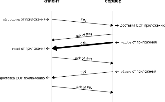 Получение FIN означает только, что в этом направлении прекращается движение потока данных. TCP, получивший FIN, может все еще посылать данные. Несмотря на то, что приложение все еще может посылать данные при наполовину закрытом TCP соединении, на практике только некоторые (совсем немного) TCP приложения используют это. Обычным является тот сценарий, который показан на рисунке 18.3. Мы опишем наполовину закрытый режим более подробно в разделе "Наполовину закрытый TCP" этой главы.