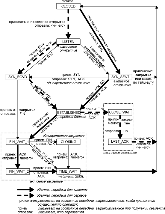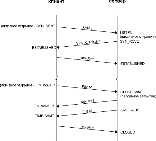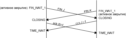 Можно сказать, что та сторона, которая первой закрывает соединение (отправляет первый FIN), осуществляет активное закрытие, а другая сторона (которая приняла этот FIN) осуществляет пассивное закрытие. Обычно, одна сторона осуществляет активное закрытие, а другая пассивное, однако в разделе "Одновременное закрытие" этой главы мы увидим, что обе стороны могут осуществить активное закрытие.