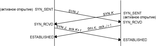 Считается, что сторона, которая посылает первый SYN, активизирует соединение (активное открытие). Другая сторона, которая получает первый SYN и отправляет следующий SYN, принимает пассивное участие в открытии соединения (пассивное открытие). (В разделе "Одновременное открытие" этой главы мы подробно опишем процедуру открытия соединения, где обе стороны считаются активными при установлении соединения.)