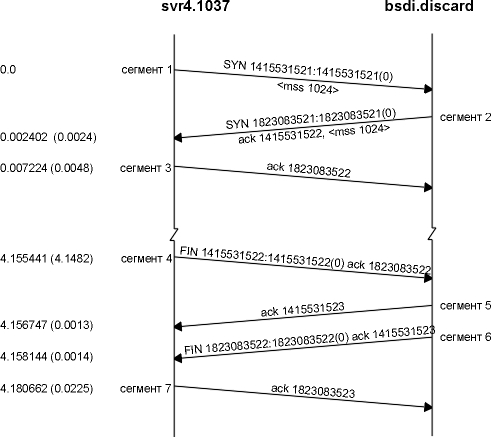 Промежуток в 4,1 секунды между сегментами 3 и 4 соответствует времени между установлением соединения и вводом команды quit для telnet, чтобы разорвать соединение.