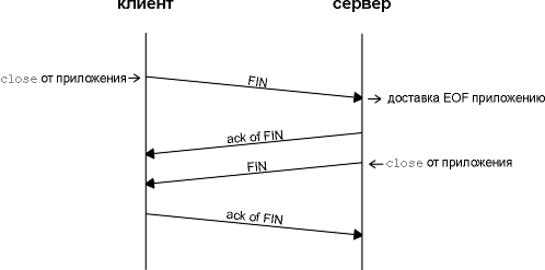 На рисунке 18.4 показан типичный обмен сегментами при закрытии соединения. Номера последовательности опушены. На этом рисунке FIN посылаются из-за того, что приложения закрывают свои соединения, тогда как ACK для этих FIN генерируется автоматически программным обеспечением TCP.