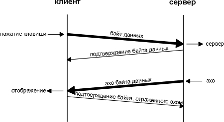 Обычно сегменты 2 и 3 объединяются - подтверждение введенного символа отправляется вместе с эхо. Мы опишем технику подобного комбинирования (которое называется задержанным подтверждением) в следующем разделе.