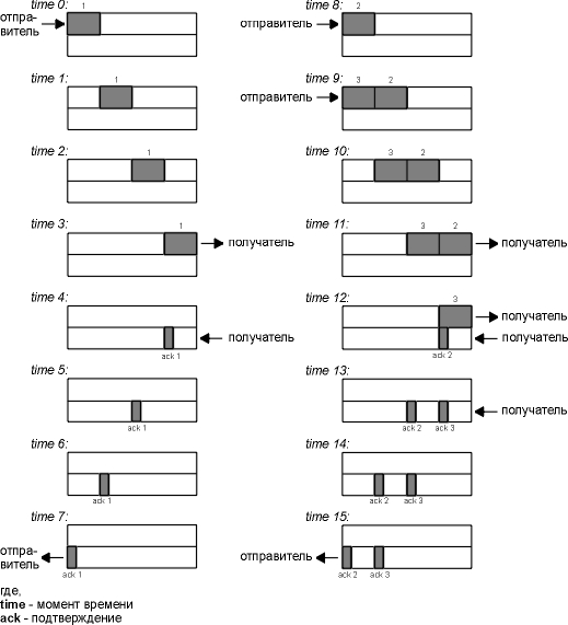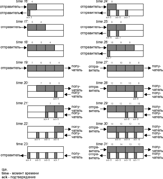 На рисунке 20.9 показана работа подобного соединения, отправитель находится слева, получатель - справа. На рисунке показано 16 моментов времени. Для простоты время показано дискретно. В верхней половине каждого рисунка мы показываем сегменты, переносящие данные слева направо, и пронумерованные как 1, 2, 3 и так далее. ACK двигаются в другом направлении и показаны в нижней половине каждого рисунка. Мы рисуем ACK меньше и указываем номера сегментов, которые подтверждаются.