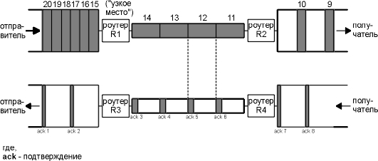 Когда маршрутизатор R2 помещает принятые пакеты в локальную сеть, находящуюся на рисунке справа от него, он сохраняет те же промежутки, который были в глобальной сети, находящейся на рисунке слева от него, несмотря на то, что ширина полосы локальной сети больше. Точно так же, промежутки между подтверждениями, которые двигаются в обратном направлении, точно такие же, как и промежутки между подтверждениями, двигавшимися по более медленному каналу.