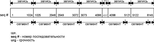 Этот рисунок также позволяет нам увидеть, как TCP осуществляет сборку пакетов из данных, которые записаны приложением. Один байт, который был выдан при входе в режим срочности, отправляется вместе со следующими 1023 байтами данных, находящимися в буфере. Следующий сегмент также содержит 1024 байта данных, а последний сегмент содержит 1 байт данных.