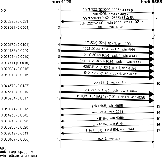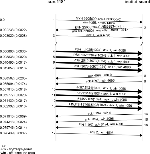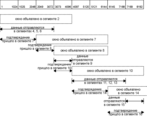 Отправитель передает четыре сегмента данных (4-7), чтобы заполнить окно объявленное получателем. Затем отправитель останавливается и ожидает подтверждения. Получатель отправляет подтверждение (сегмент 8), однако объявляет окно равное 0. Это означает, что получатель получил данные, однако все они находятся в TCP буферах получателя, потому что приложение не имеет возможности считать данные. Еще один ACK (называемый обновлением окна) посылается через 17,4 миллисекунды и объявляет о том, что получатель теперь может получить следующие 4096 байт. То, что выглядит как подтверждение (ACK), в действительности является обновлением окна, потому что здесь не происходит подтверждения каких-либо вновь полученных данных, а просто объявляется новый размер окна.