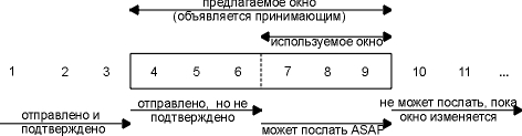 С течением времени размер окна сдвигается вправо, по мере того как принимающий подтверждает данные. Взаимное перемещение двух границ окна увеличивает или уменьшает его размер. Для описания перемещения границ окна вправо и влево используются три термина.