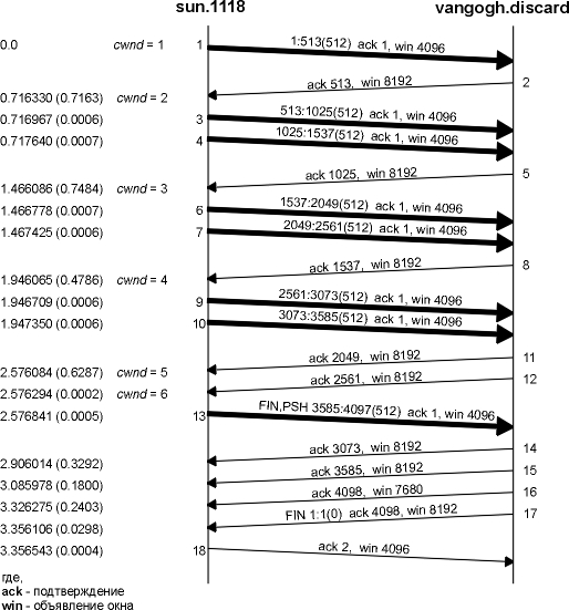 Мы видим, что отправитель отправляет один сегмент с 512 байтами данных, а затем ожидает ACK. ACK получено через 716 миллисекунд, что определяет время возврата. Затем окно переполнения увеличивается до двух сегментов, и эти два сегмента отправляются. Когда ACK получен в сегменте 5, окно переполнения увеличивается до трех сегментов. Несмотря на то, что может быть послано три сегмента, отправляется только два, перед тем как не будет получен еще один ACK.