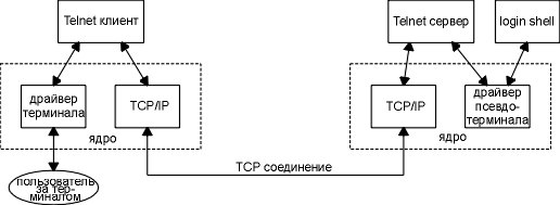 Приложения удаленного терминала используют стандарт клиент-сервер. На рисунке 26.1 показано типичное общение Telnet клиента и Telnet сервера. (Точно такой же рисунок можно нарисовать для Rlogin клиента и Rlogin сервера.)