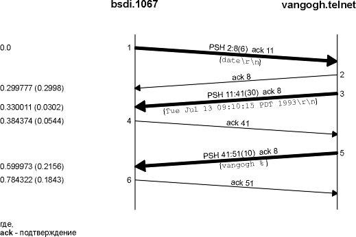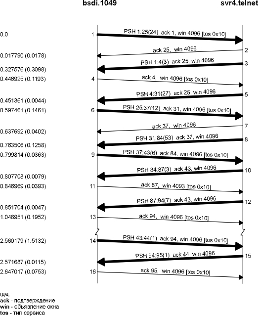 На рисунке 26.5 показана временная диаграмма для Rlogin соединения от хоста bsdi к серверу svr4. (Мы удалили все связанное с установлением TCP соединения, объявлением окна, а также информацию о типе сервисов.)