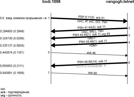Давайте посмотрим, что делает Telnet, когда клиент вводит символ прерывания. Мы открыли сессию между клиентом bsdi и сервером vangogh.cs.berkeley.edu. На рисунке 26.17 показана временная диаграмма того, что происходит, когда вводится символ прерывания. (Мы удалили объявления окна и тип сервиса.)
