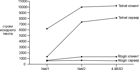Рисунок 26.2 Сравнение размеров исходных текстов Telnet/Rlogin/клиент/сервер.
