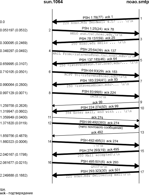 На рисунке 28.2 приведена временная диаграмма SMTP соединения между отправителем SMTP (клиент) и получателем SMTP (сервер). Мы удалили все связанное с установлением и разрывом соединения, а также объявления размера окна.