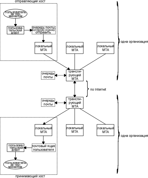 Между отправителем и получателем присутствует четыре MTA. Локальный MTA на хосте отправителя просто доставляет почту на свой транслирующий MTA. (Этот транслирующий MTA должен иметь имя mailhost в домене организации.) Здесь SMTP использует локальные сети организации. Затем транслирующий MTA организации отправителя посылает почту по Internet на транслирующий MTA организации получателя. Другие транслирующие MTA доставляют почту на хост получателя после общения с локальными MTA хоста получателя. Все MTA в примере используют SMTP, хотя существует возможность того, что на этом пути могут встретиться и другие протоколы доставки.