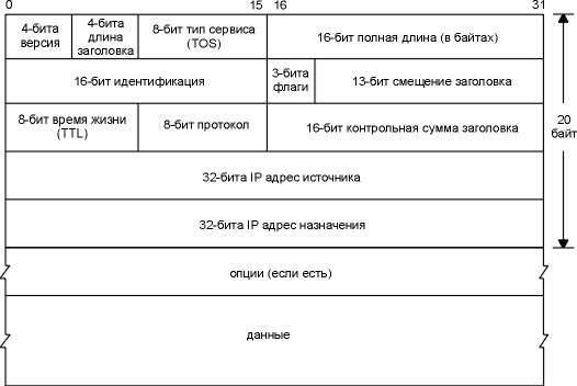 На рисунке 3.1 показан формат IP датаграммы. Стандартный размер IP заголовка составляет 20 байт, если не присутствуют опции.