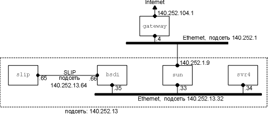 Если Вы сравните этот рисунок с одним из тех, что показаны на внутренней стороне обложки, то заметите, что мы опустили некоторые детали, которые описывают подсоединение маршрутизатора sun к верхнему Ethernet. (посредством SLIP соединения). Это не влияют на наше описание деления на подсети в данном разделе. Мы вернемся к подобному SLIP соединению в разделе "Уполномоченный агент ARP" главы 4, когда будем описывать уполномоченного агента ARP.