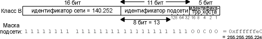 Маска подсети для всех интерфейсов в подсети 140.252.13 установлена в 255.255.255.224 или 0xffffffe0. Это означает, что крайние правые 5 битов отводятся на идентификатор хоста, а 27 бит слева оставлены на идентификатор сети и идентификатор подсети.