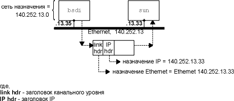 Датаграмма передается в драйвер устройства Ethernet и посылается на sun в виде Ethernet фрейма (рисунок 2.1). Адрес назначения в IP датаграмме это IP адрес Sun (140.252.13.33), а адрес назначения в заголовке канального уровня это 48-битовый Ethernet адрес интерфейса Ethernet машины sun. 48-битный Ethernet адрес получается с использованием ARP, как это делается - мы увидим в следующей главе.
