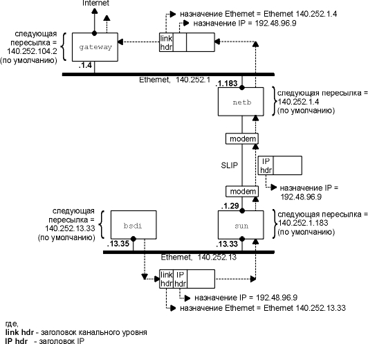 Обратите внимание на то, что в Ethernet не используется инкапсуляция завершителей (глава 2, раздел "Инкапсуляция завершителей") и что Ethernet поддерживает широковещательные запросы, тогда как SLIP канал это канал точка-точка.