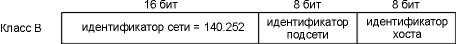 После получения от InterNIC идентификатора сети определенного класса, системный администратор решает, делить ли сеть на подсети или нет, а если делить, то сколько бит будет отведено на идентификатор подсети и сколько на идентификатор хоста. Например, сети, описываемые в этом тексте, имеют адреса класса В (140.252), а из оставшихся 16 бит 8 отводятся под идентификатор подсети, а 8 на идентификатор хоста. Это показано на рисунке 3.5.